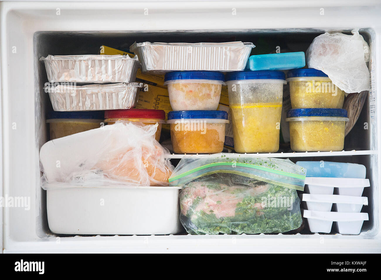 A Freezer Packed With Chicken Soup And Various Frozen Food Stock