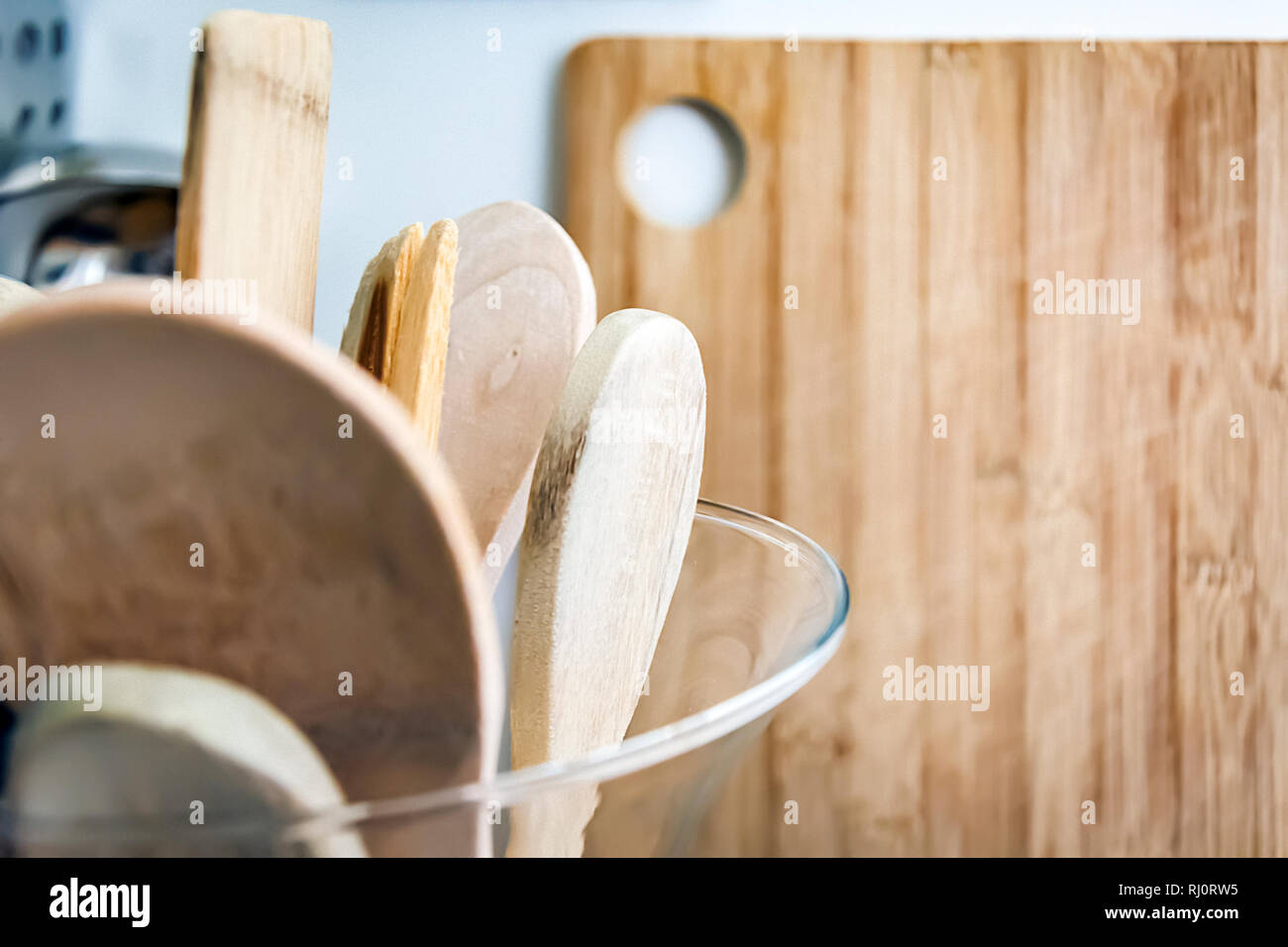 Wooden Kitchen Utensils In A Glass Container With A Wooden Cutting
