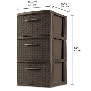 You can use it to hold clothing towels craft supplies toys and more. The drawer opens easily with the modern built in handle design and stops before you can pull it out to prevent the drawer from accidentally tipping over. Sterilite 25306p01 3 drawer wide weave tower espresso frame drawers w driftwood handles 1 pack.