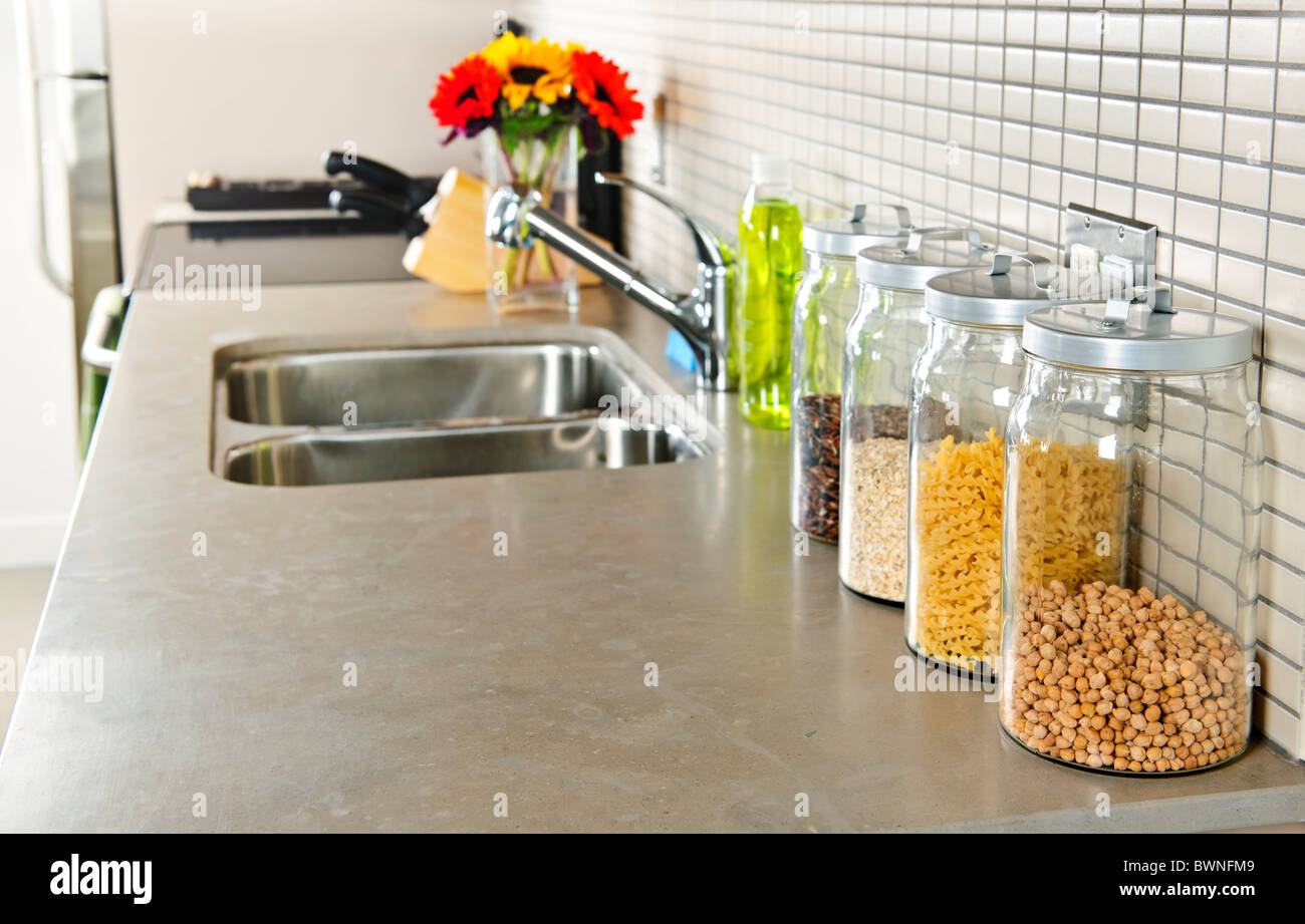 Modern Small Kitchen Interior With Glass Jars On Natural Stone