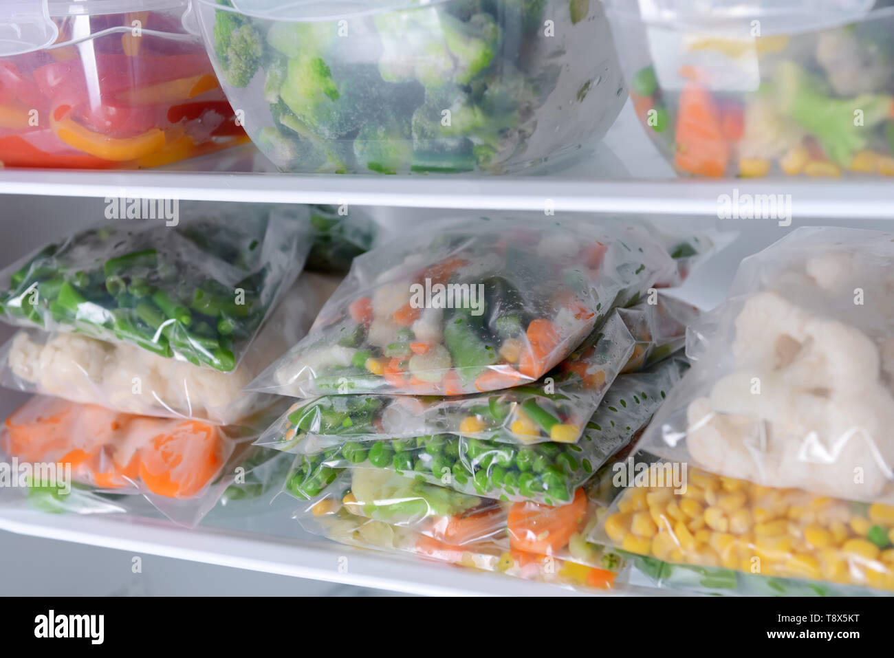 Containers And Plastic Bags With Frozen Vegetables In Refrigerator