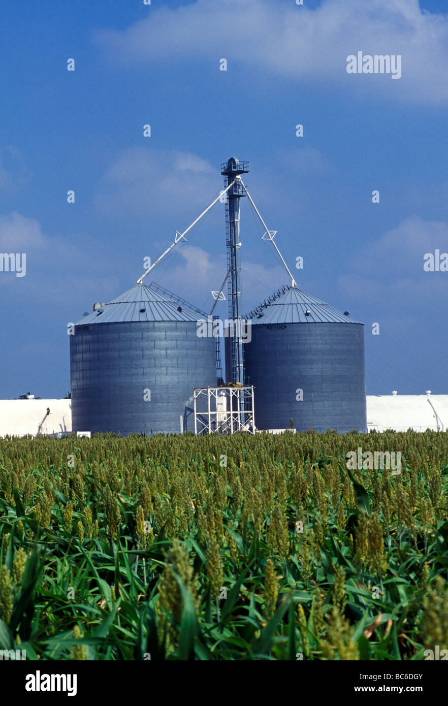 Corn Field And Storage Containers Texas Usa Stock Photo