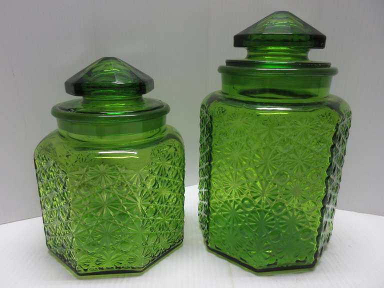 Albrecht Auctions 2 Vintage Green Pressed Glass Canisters With