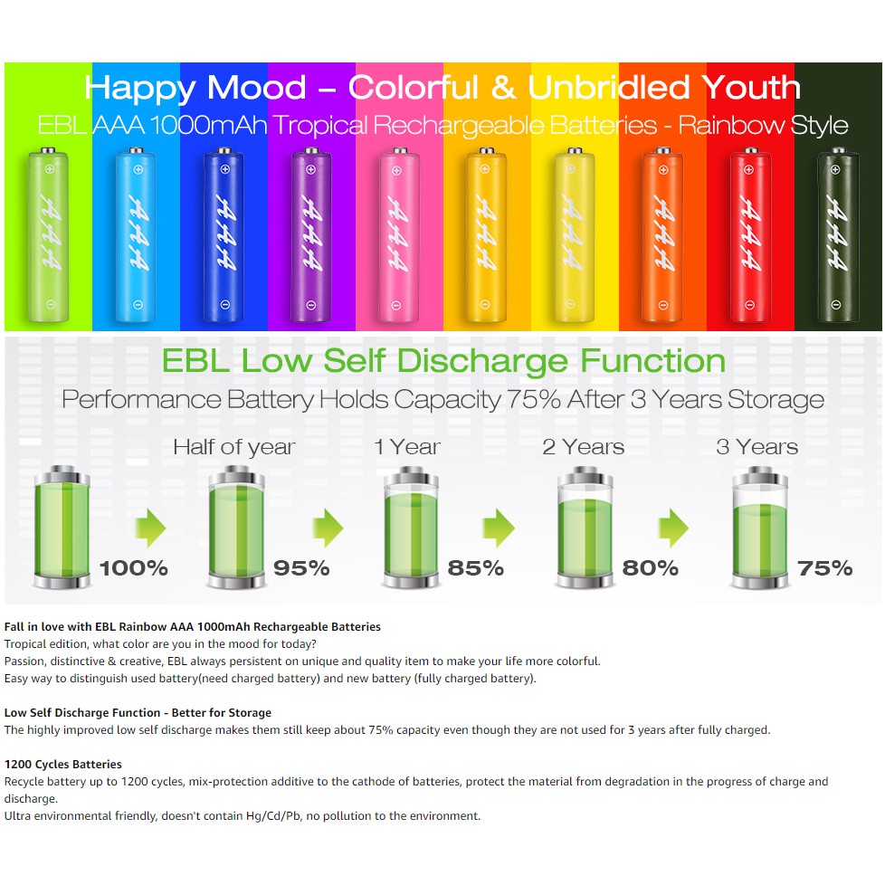 Ebl Multi Color 10 Pack 1 2v Aaa Size 1000mah Rechargeable Battery