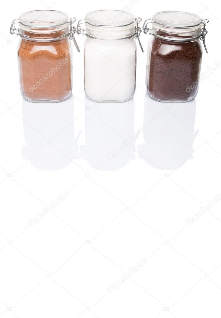 Instant Coffee Chocolate Drink Powder And Sugar In Glass Jar