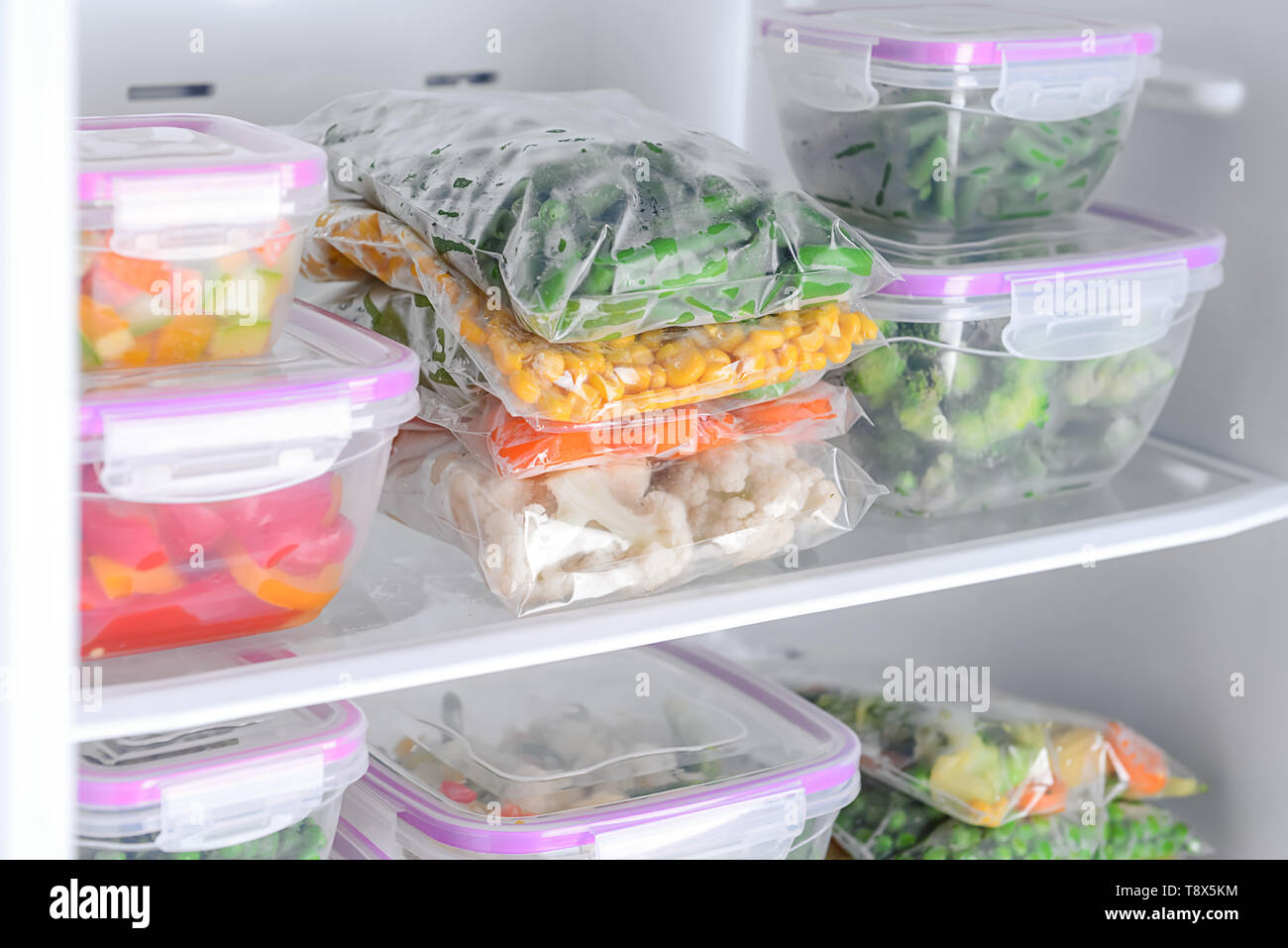 Containers And Plastic Bags With Frozen Vegetables In Refrigerator