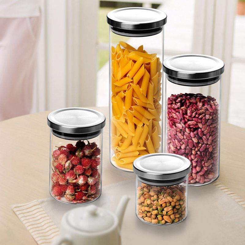 Round Glass Spaghetti Pasta Cereal Food Storage Airtight Tin Jar