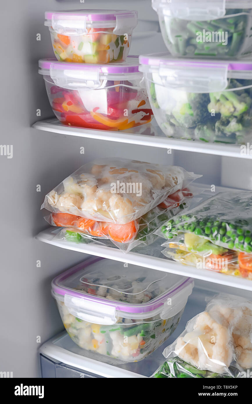 Frozen Food In The Refrigerator Vegetables On The Freezer Shelves