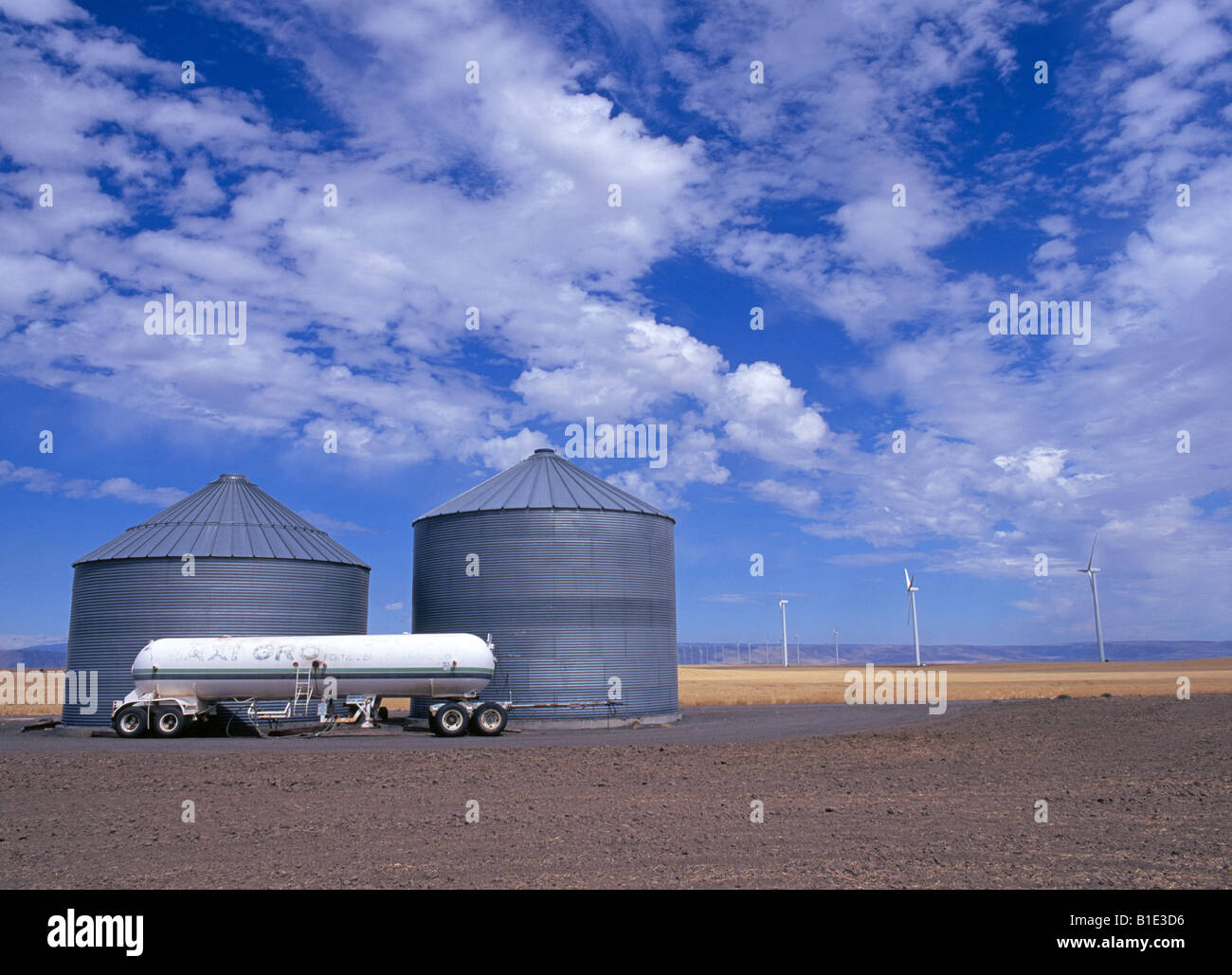 A Fertilizer Tank And Two Wheat Storage Containers Sit On A Farm